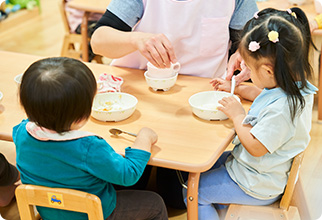 1歳児と2歳児が同じ保育室で過ごし、年齢を超えた関わりの中で、思いやりや社会性を育てています。遊びや行事は成長に合わせて工夫しています。